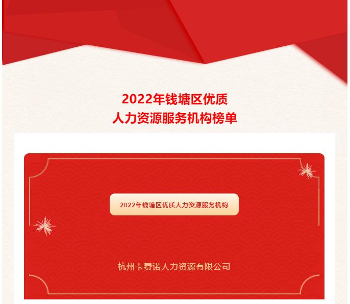 為進一步促進錢塘區人力資源服務業高質量發展,發揮骨干企業在行業發展中的引領示范作用,根據《杭州市錢塘區關于聚焦人的現代化打造英才高地的若干舉措》(錢塘區委人〔2021〕1號)文件精神,22年區人社局委托浙江省人力資源服務協會星級機構評定專家團隊,圍繞“基礎條件、市場競爭力、交易誠信及社會性、經營管理、財務風險、企業用工保障、部門配合、錢塘貢獻”等多項維度指標,對參評企業進行綜合評估,挖掘出一批綜合實力強、服務能力專、行業影響力的優質機構,杭州卡費諾企業服務有限公司被選為優質人力資源機構之一!